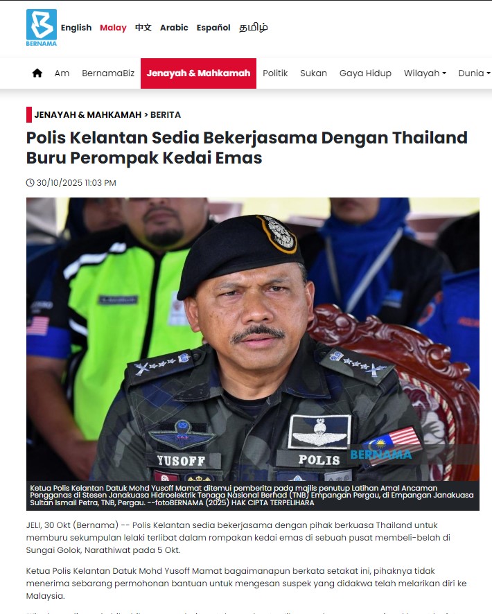 โกตาบารู (มาเลเซีย) : เจ้าหน้าที่ไทยได้เปิดเผยภาพผู้ต้องสงสัย 5 รายที่เกี่ยวข้องกับบุกปล้นร้านทองเยาวราชกรุงเทพ ซึ่งตั้งอยู่ภายในห้างบิ๊กซี สาขาสุไหงโก-ลก อ.สุไหงโก-ลก จ.นราธิวาส เมื่อ 5 ต.ค.68 ที่ผ่านมา กลุ่มคนร้ายจะกวาดทองรูปพรรณไปได้ จำนวนทั้งสิ้น 540 บาท และในระหว่างหลบหนี ซึ่งเชื่อกันว่าได้หลบหนีไปมาเลเซีย
