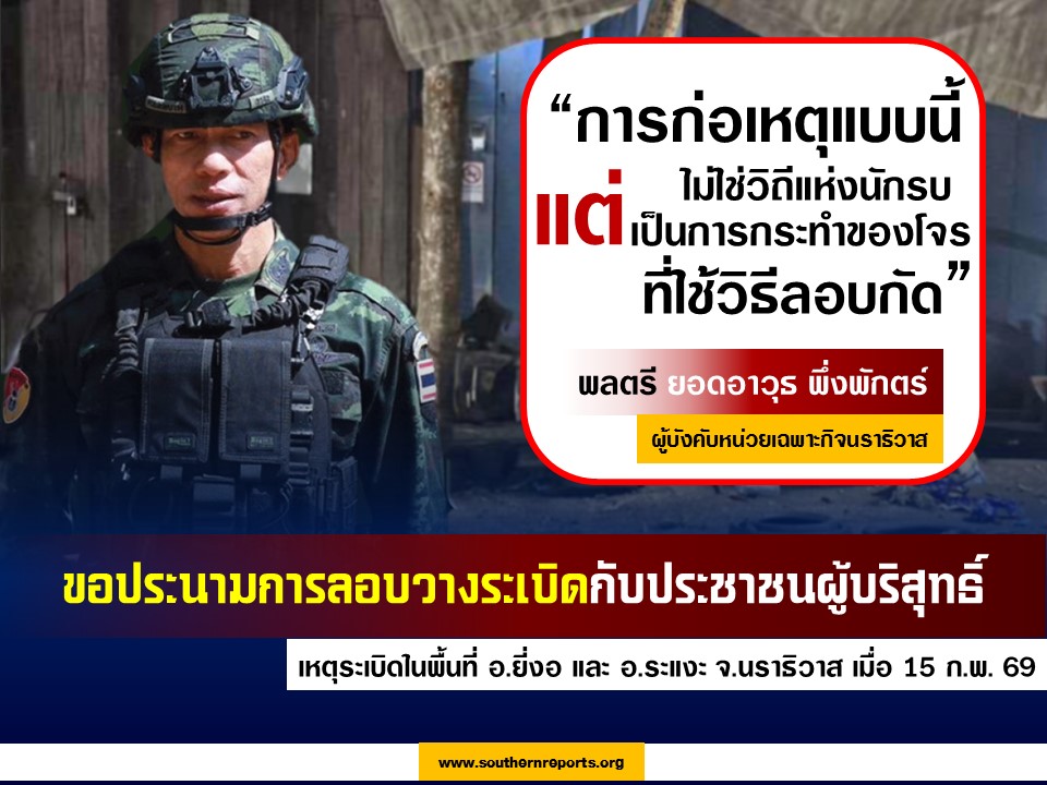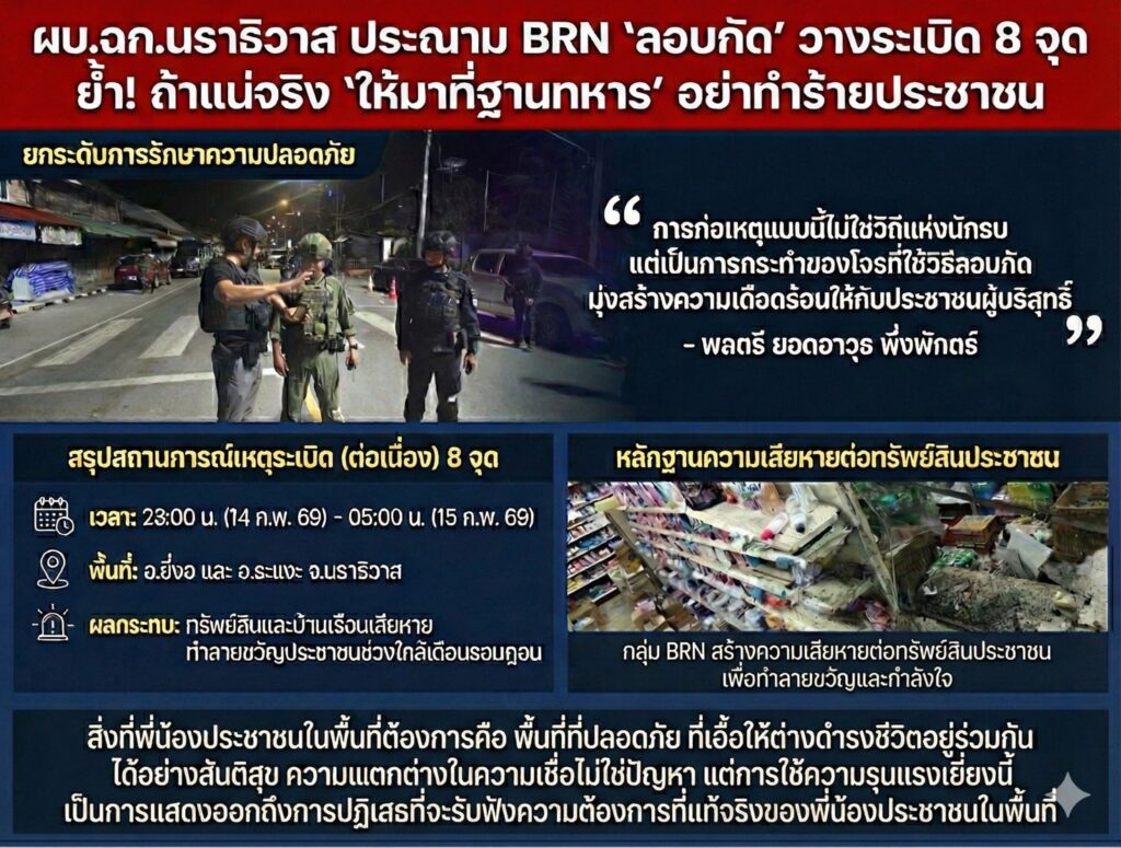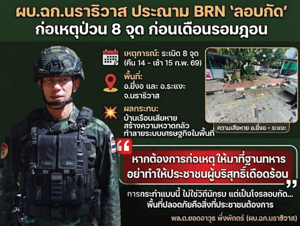 จากเหตุระเบิด (ต่อเนื่อง) 8 จุด นับตั้งแต่เวลา 23:00 ของคืนวันที่ 14 ก.พ.69 จนถึง 05:00 ของ เช้าวันที่ 15 ก.พ.69 ในพื้นที่ อ.ยี่งอ และ อ.ระแงะ จว.นราธิวาส โดยกลุ่ม BRN สร้างความเสียหายให้ทรัพย์สินและบ้านเรือนของประชาชน แม้จะไม่มีผู้ได้รับบาดเจ็บ แต่ก็เป็นการทำลายขวัญและกำลังใจของประชาชนในพื้นที่เป็นอย่างมาก โดยเฉพาะในห้วงเวลาที่เข้าใกล้ เดือนรอมฏอน อันเป็นเดือนอันประเสริฐสำหรับพี่น้องชาวมุสลิมในพื้นที่