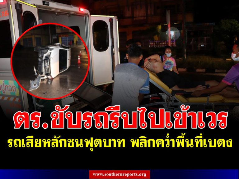 ตำรวจเบตง ขับกระบะ รีบไปเข้าเวร ฝนตกถนนลื่น รถเสียหลักชนฟุตบาท พลิกคว่ำกลางถนน โชคดีบาดเจ็บเล็กน้อย
