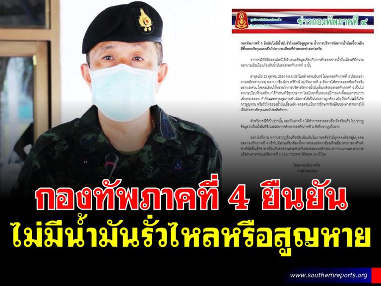 กองทัพภาคที่ 4 ยืนยันไม่มีน้ำมันรั่วไหลหรือสูญหาย ย้ำการบริหารจัดการน้ำมันเชื้อเพลิงมีขั้นตอนรัดกุมและเป็นไปตามระเบียบที่กำหนดอย่างเคร่งครัด