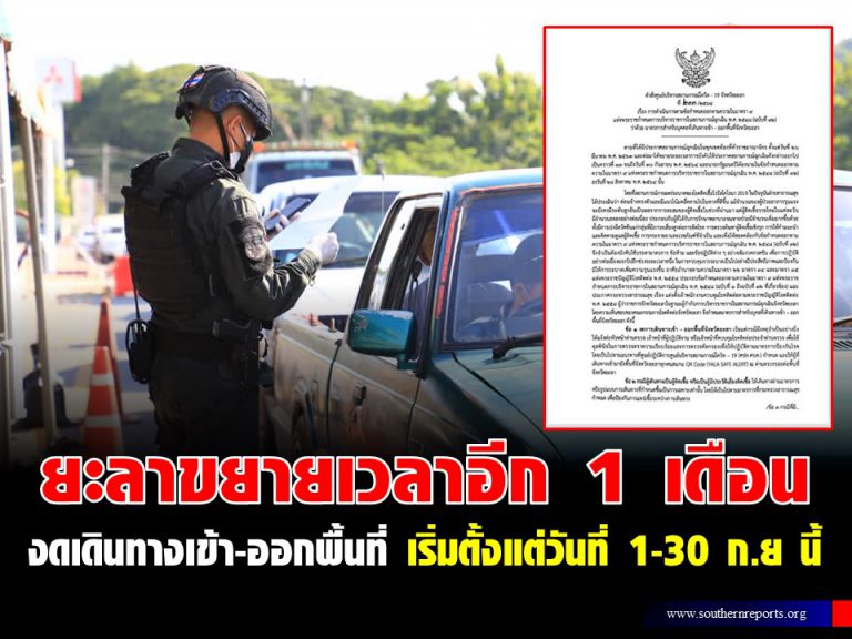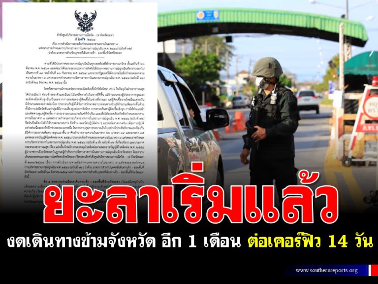 ยะลาขยายเวลาไปอีก 1 เดือน งดเดินทางเข้า-ออกพื้นที่ เริ่มตั้งแต่วันที่ 1-30 ก.ย นี้