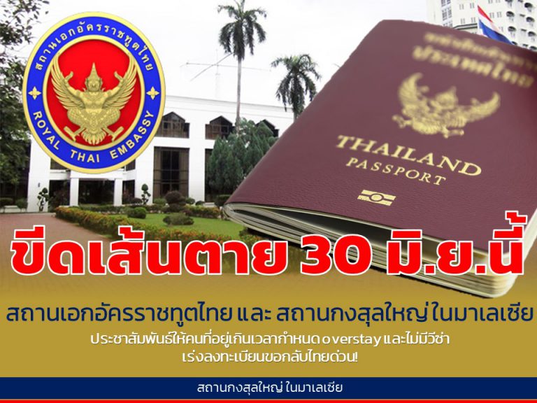 สถานเอกอัครราชทูตไทย และ สถานกงสุลใหญ่ ในมาเลเซียประชาสัมพันธ์ให้คนที่อยู่เกินเวลากำหนด overstay และไม่มีวีซ่า เร่งลงทะเบียนขอกลับไทย ขีดเส้นตาย 30 มิถุนายนนี้
